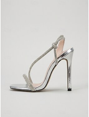 Sandálias femininas prateadas com salto agulha e strass, modelo aberto com tira em T, elegantes para festas de coquetel e eventos noturnos. &ocasiões formais