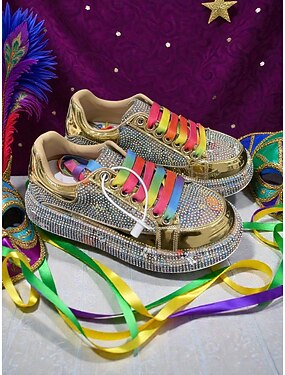 Tênis de Strass Arco-Íris Femininos de Mardi Gras com Detalhes Metálicos em Ouro - Ousados e Brilhantes Perfeitos para Carnaval Festas à Fantasia Festivais e Estilo de Rua