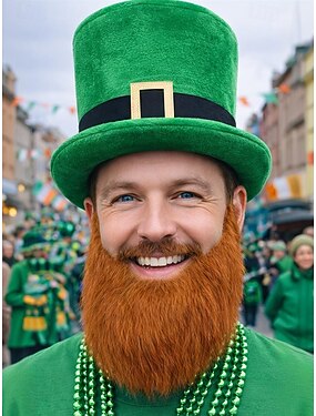 Conjunto masculino de chapéu de duende e barba falsa para o Dia de São Patrício, cartola irlandesa verde com barba falsa removível, material de poliéster macio, várias opções de cores para desfiles, festas e festivais.