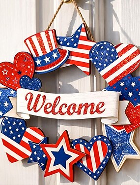 Decorações de madeira para o 4 de julho, guirlandas patrióticas para porta de entrada, decorações para o Dia da Independência, símbolo de boas-vindas com a estrela, Dia da Memória, decoração de parede