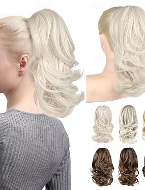 Extensão de rabo de cavalo - 35 cm (14") com presilha, aplique de cabelo sintético macio e natural, ondulado e em camadas, para mulheres - platinado