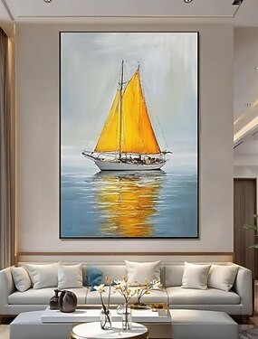 Pintura a óleo grande, feita à mão, de um veleiro abstrato amarelo sobre tela, com paisagem náutica, arte de parede com textura de veleiro, pintura acrílica para decoração de sala de estar.