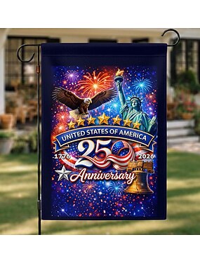 Bandeira de jardim comemorativa do 250º aniversário dos EUA, com águia, Estátua da Liberdade e fogos de artifício, perfeita para decoração ao ar livre.