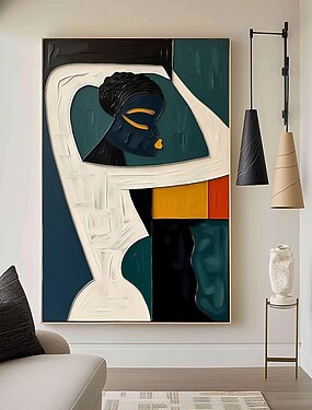 Pintura abstrata feita à mão de paisagem marinha sobre tela, menina de vestido rosa, abstrata e moderna, tela esticada.