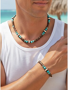 colar masculino de contas naturais com detalhes em madeira e turquesa – joias estilo surf boêmio para looks casuais, festivais de verão e moda praia