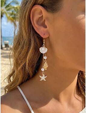 Brincos femininos boêmios com pingente de estrela-do-mar e concha em liga metálica, brincos pendentes multicoloridos para praia, viagens, resorts e uso casual no dia a dia.