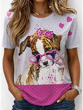 Mulheres Camiseta Imprimir Gráfico Animal Cachorro Vintage à moda Clássico Manga Curta Gola Redonda Decote Redondo Tops regulares Casual Diário Final de semana Cinza branco Branco Branco 2 Verão