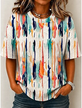Mulheres Camiseta Waffle Tops tricotados texturizados Camiseta Tops de verão Ombro caído Imprimir Gráfico Geométrica Abstrato Vintage à moda Clássico Manga Curta Gola Redonda Decote Redondo Tops