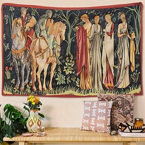 Tapeçaria de parede medieval estilo William Morris com cavaleiros e damas, movimento pré-rafaelita de artes e ofícios, cena de floresta, grande, para sala de estar, escritório ou decoração de casa.