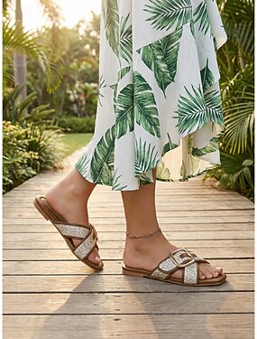 Sandálias rasteiras femininas elegantes em tom marrom com tiras cruzadas - confortáveis sandálias de bico quadrado com fivela dourada. &Padrão texturizado entrelaçado, ideal para férias na praia e