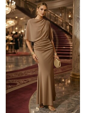 Sereia Longo Vestidos de noite Elegante Meia Manga Gola Redonda Festa de Noite Casamento Elastano Tecido Lurex com Pregas Franzido Cor Única