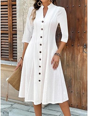 Mulheres Vestido midi Linho de algodão sintético Vestido de verão Básico Clássico Diário Férias Ajuste Largo Tecido Meia Manga Decote V Azul Branco Verde Claro Damasco Verão Primavera