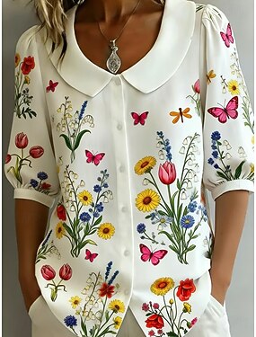 Mulheres Blusa Botões Imprimir Floral Gráfico Diário à moda Casual Meia Manga Decote Quadrado Tops regulares Casual Diário Azul Bege Verão Primavera
