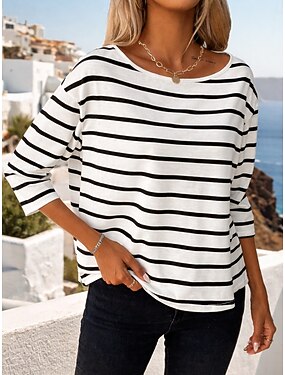 Mulheres Blusa Tops de renda Listrado Côr Sólida à moda Básico Clássico Manga Curta Gola Redonda Tops longos Casual Diário Branco e Preto Branco vermelho Azul Marinha Verão Primavera