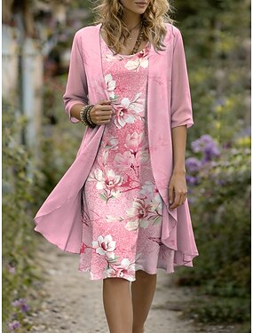 Mulheres conjunto de vestido Vestido A Line Elegante Férias Floral Gráfico Multi Camadas Imprimir Vestido midi Meia Manga Gola Redonda Diário Azul Rosa Roxo Verão Primavera Normal