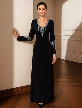Vestido de festa comprido modelo sheat coluna Tea Length vestido de coquetel vestido para convidada de casamento vestido para mãe da noiva manga longa decote em V elegante formal com Lycra e estrass