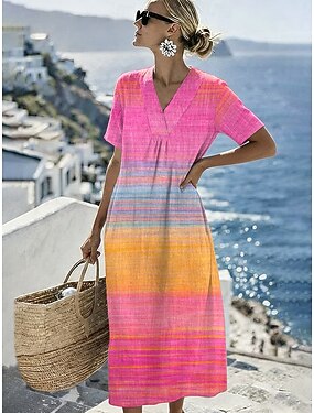 Mulheres Vestido midi Vestido A Line Férias Casual Ao ar livre Para Noite Padrão Floral Manga Curta Decote V Arco-Íris Verão Primavera