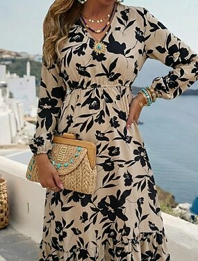 Mulheres Vestido midi Vestido casual Vestido A Line Férias Casual Boho Praia Festa Normal Floral Gráfico Geométrica Manga Longa Decote V Azul Verão Primavera