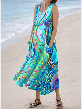 Vestido Midi Feminino Estilo Linho Vestido Shift Praia Casual Saída Ajuste Solto Gráfico Geométrico Sem Manga Decote Redondo Azul Vermelho Roxo Verde Verão Primavera