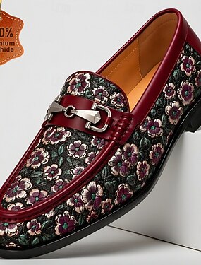 Mocassins sociais masculinos em couro sintético com estampa floral, modelo elegante sem fecho, ideais para casamentos, festas e eventos formais.