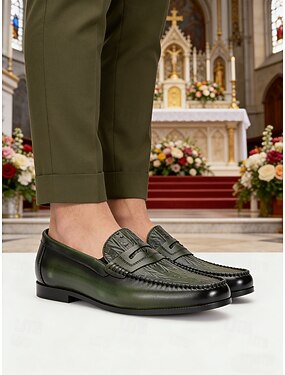 mocassins masculinos com textura de crocodilo verde e borla - look casual natalino estiloso, perfeito para festas de fim de ano e celebrações festivas