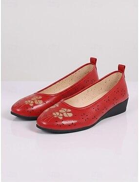 Sapatilhas femininas vermelhas respiráveis com recortes e salto anabela, em couro sintético com estampa floral, confortáveis e fáceis de calçar para uso diário. &passeios de verão