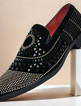Sapatos masculinos slip-on em couro sintético – nas cores amarelo e preto com detalhes de tachas, calçado moderno para casamentos ousados e ocasiões especiais.