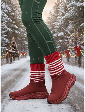 Botas femininas de cano médio em camurça sintética vermelha com fivelas ajustáveis e sola antiderrapante, botas casuais de malha confortáveis para o Natal &uso diário