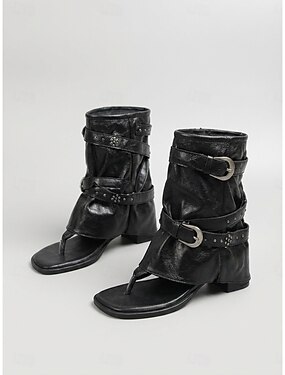 Botas pretas femininas de cano curto com fivela – calçado moderno em couro sintético para festivais de música ao ar livre.