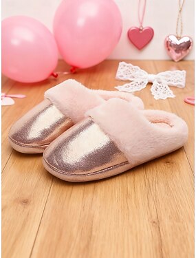 Pantufas femininas rosa metálicas com acabamento em pele sintética – pantufas brilhantes e macias, perfeitas para o quarto, dias de spa, para damas de honra e como presentes de Dia dos Namorados.