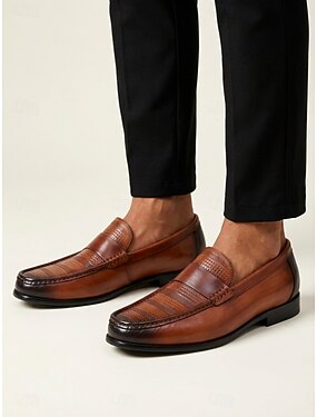 Mocassins masculinos em couro marrom, estilo clássico sem fecho com detalhes texturizados, design elegante e formal para casamentos, negócios e cerimônias especiais.