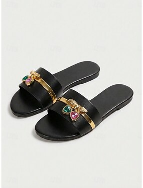 Sandálias femininas pretas com strass e formato de folha - elegantes mules de salto baixo e grosso, perfeitas para férias luxuosas à beira da piscina em resorts tropicais. &eventos noturnos de verão