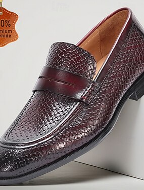 Mocassins penny masculinos em couro trançado marrom com textura artesanal, modelo slip-on para uso casual de negócios, ideais para o escritório, banquetes, eventos formais e ocasiões casuais elegantes.