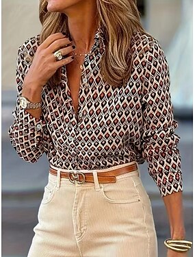 Mulheres Camiseta Com Corte Imprimir Gráfico Geométrica Vintage à moda Moderno Manga Longa Decote V Tops regulares Diário Branco Rosa Rosa empoeirada Marron Cáqui Primavera Outono