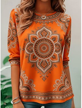 Camiseta Feminina Boho Estampa Gráfica Tribal Vintage Estilosa Casual Manga Longa Decote em V Tops Regulares Diário Estampa Amarela Primavera Outono