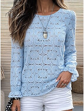 Mulheres Blusa Renda Patchwork Côr Sólida à moda Casual Manga Longa Gola Redonda Tops regulares Diário Azul Verão Primavera Outono