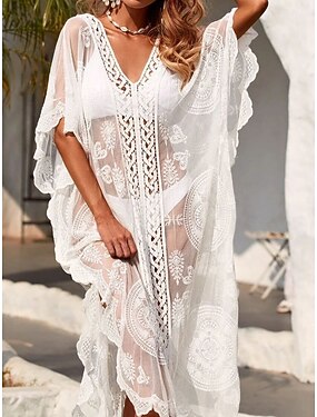 Mulheres Roupa de Banho Cobertura Vestido de Banho roupa de banho Renda Férias Roupa de Praia Côr Sólida Decote Redondo Manga Curta Fatos de banho