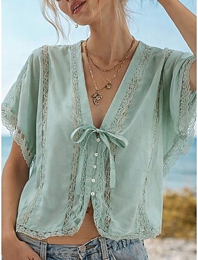 Blusa de Linho Feminina Como Algodão Falso Tops de Renda Renda Sólida Estilosa Casual Manga Curta Decote em V Tops Cropped Diários Verde Verão Primavera Outono