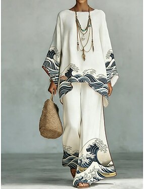 Mulheres Conjuntos de calças Manga Longa Decote Redondo Gráfico Imprimir Moda Roupa de rua Casual Diário Ao ar livre Branco Primavera Verão Ajuste Largo