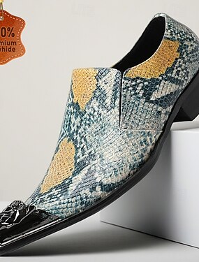 Sapatos masculinos de couro com estampa de cobra exótica e acabamento brilhante – calçados de luxo de grife para festas noturnas e eventos VIP.