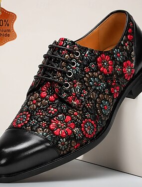 Sapatos sociais masculinos de couro com cadarço e estampa floral vermelha, elegantes e confortáveis para festas noturnas, casamentos e ocasiões especiais.