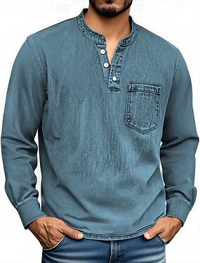 Camiseta Henley masculina vintage, 100% algodão, lavagem ácida, manga longa, estilo retrô outono/inverno, design nostálgico, nas cores preto, rosa e azul marinho.