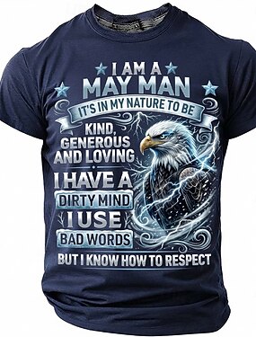 Camiseta masculina "Eu sou um homem de maio" com estampa engraçada, sarcástica e de humor adulto, ideal para aniversários. Design com águia careca, gola redonda e manga curta. Cor azul marinho. Ideal