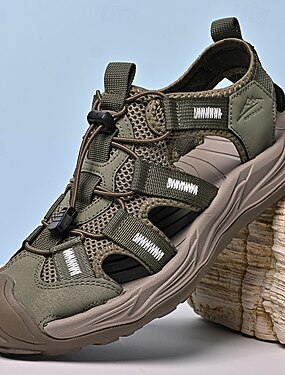 Sandálias esportivas masculinas de bico fechado na cor verde-oliva, respiráveis e ideais para caminhadas e atividades aquáticas ao ar livre. Estilo casual e robusto, perfeitas para trilhas, camping, viagens e outras atividades de verão ao ar livre.