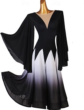 vestido de dança de salão feminino preto e branco com decote em V profundo e mangas esvoaçantes – ideal para dança latina, tango e performance