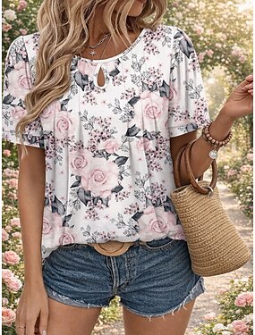 Mulheres Camiseta T-shirt Franzido Imprimir Floral Gráfico Moda à moda Casual Manga Curta Gola Redonda Tops regulares Diário Para Noite Final de semana Branco Rosa Vermelho Roxo Claro Roxo Verão
