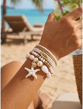 Conjunto de pulseiras femininas boêmias multicamadas, em liga metálica e resina, com pingentes de estrela-do-mar e concha, perfeitas para férias na praia e para o dia a dia.