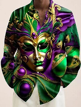 Carnaval Homens Máscara Carnaval Contas Camisa Social camisa de botão Manga Longa Moda Casual Festa Feriado Primavera Outono Aberto para a Lateral Impressão 3D camisas de colarinho Azul Roxo Verde