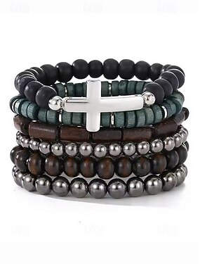 Conjunto de pulseiras masculinas de contas com pingente em cruz, pulseiras elásticas de madeira e metal multicamadas, joias boho da moda para uso casual, de festa e diário
