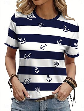 Mulheres Camiseta Imprimir Gráfico Listrado Âncora Vintage à moda Clássico Manga Curta Gola Redonda Tops regulares Diário Final de semana Azul Verão Primavera